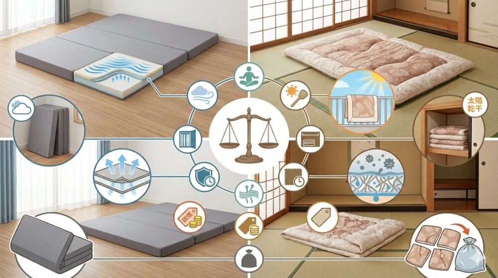この記事では、三つ折りマットレスと敷布団のどちらを選ぶべきか、7つのポイントで比較してきました。
