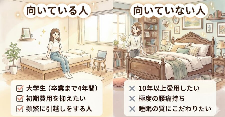 - 搬入・組立:「脚を回すだけで完成。引っ越し初日からすぐに寝られるのが最大のメリット」といったレビュー。