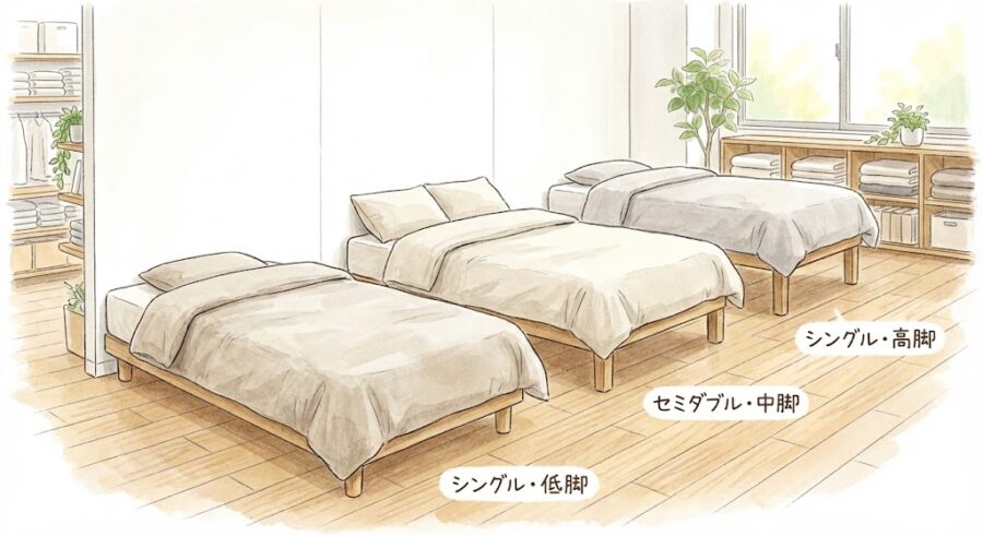 - 脚の高さ: 収納重視なら26cm、開放感重視なら10〜12cmを選びましょう。